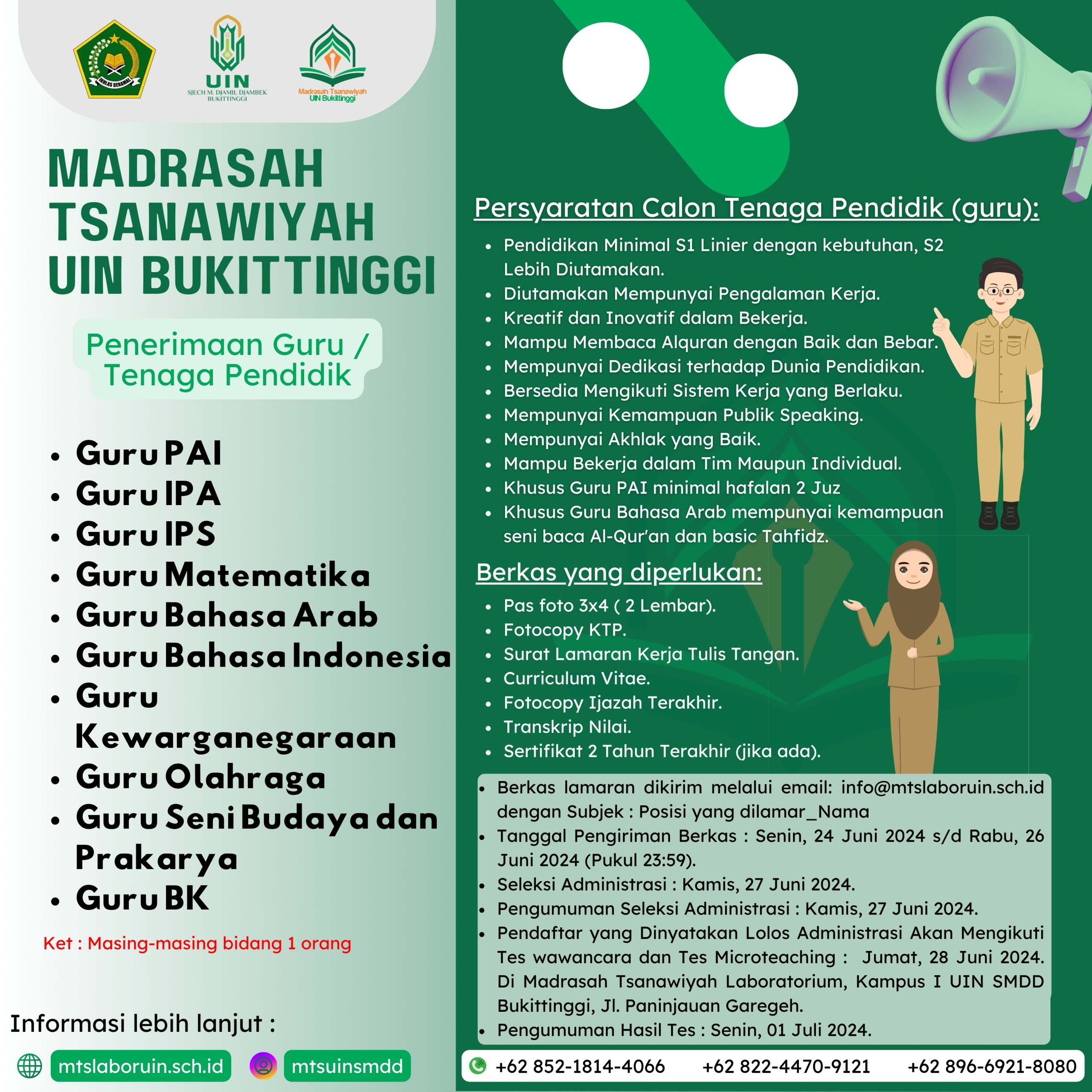 Sehubungan dengan akan memasuki tahun ajaran 2024/2025 Madrasah Tsanawiyah (MTS) Laboratorium UIN (Universitas Islam Negeri) Bukittinggi mengumumkan pembukaan posisi untuk Tenaga Pendidik (guru) sebagai upaya guna memperlancar proses akademis di sekolah.